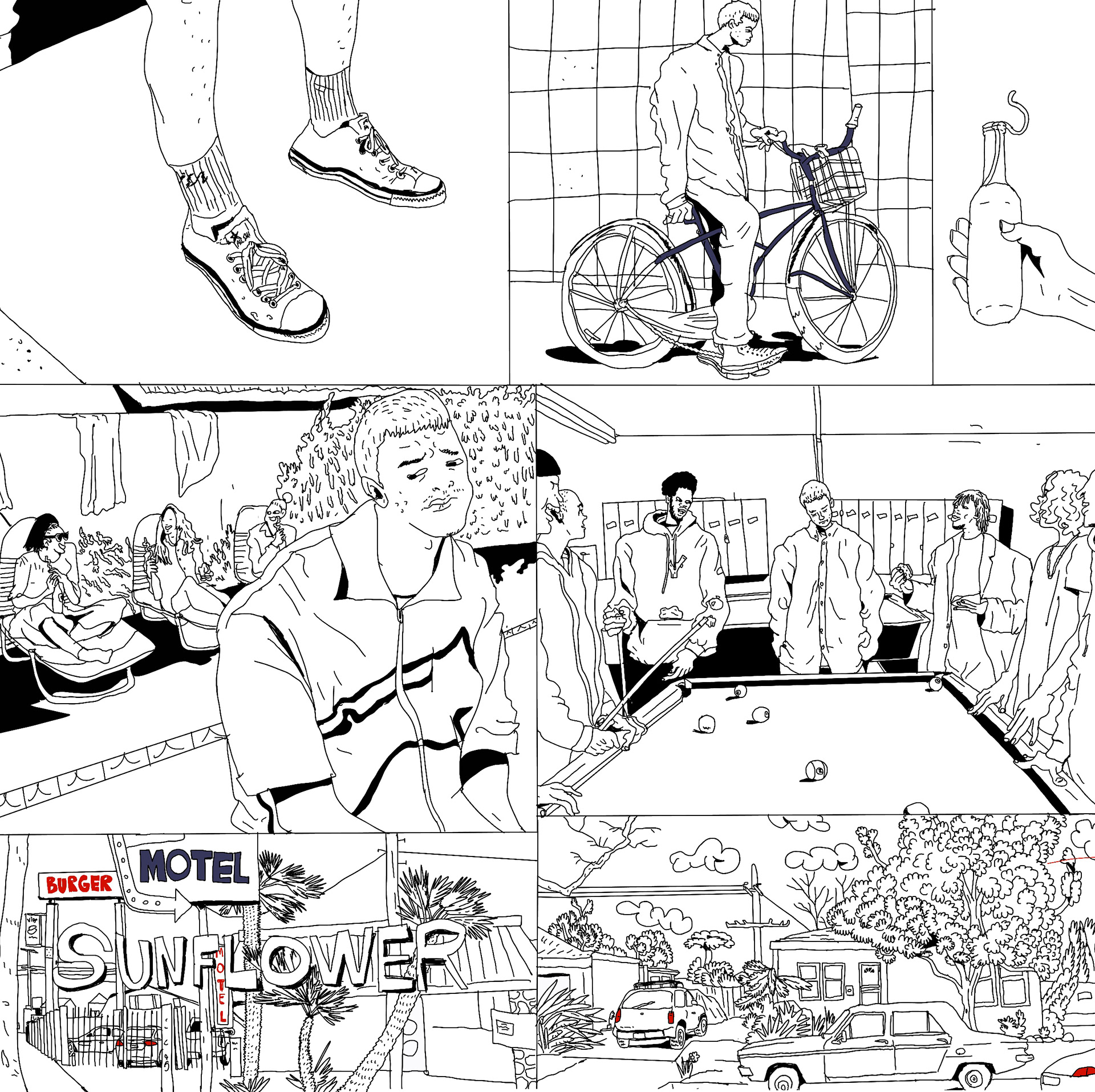 Neste projeto pessoal a ideia foi produzir um quadrinho a partir de um videoclipe selecionado. os frames que compõem a intro de sunflower, videoclipe de rex orange county, foi a inspiração para a produção do quadrinho abaixo.